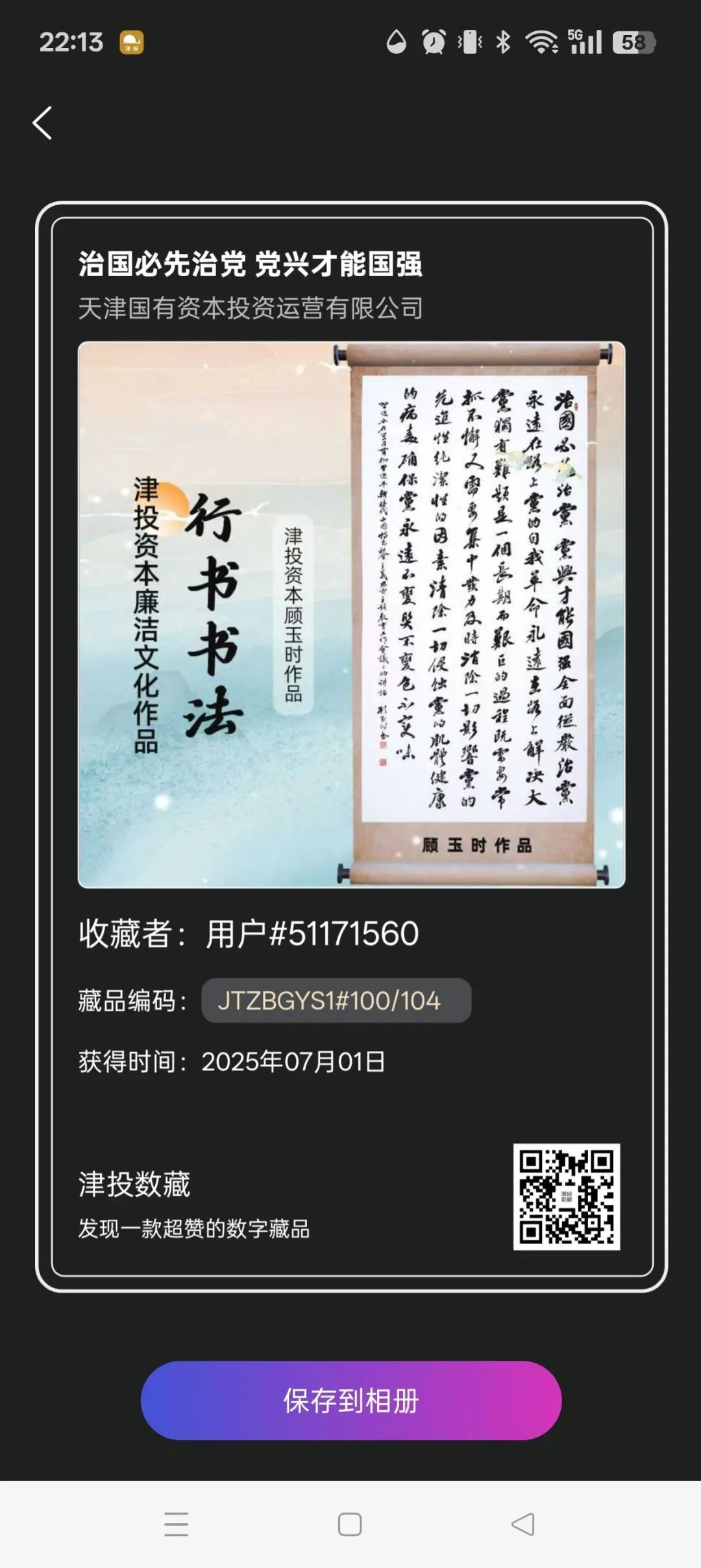 此次首发的“廉洁文化廊数字藏品”限量发行104枚,既是庆祝建党104周年的深情献礼,更是津投资本用数字技术赋能廉洁文化的生动实践,把每枚藏品都打造成一张“永不褪色的廉洁名片”。