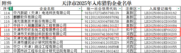 近日,天津市科学技术局发布了《2025年天津市猎豹企业入库名单公告》,津投资本所属天津数字经济产业集团有限公司(以下简称“天数集团”)旗下天津市天科数创科技股份有限公司、天津市中环系统工程有限责任公司,凭借在核心技术攻关、研发投入强度、科技成果转化等方面的突出表现,成功入选天津市首批猎豹企业名单。